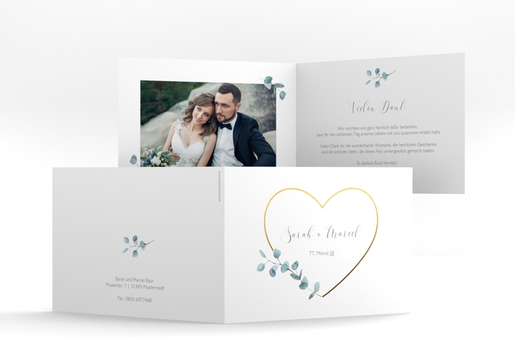 Ein dezenter Eukalyptus-Zweig schmückt das goldfarbene Herz auf der Danksagungskarte Greenheart. Die Namen des Brautpaars und das Hochzeitsdatum erhalten so einen edlen Rahmen auf der A6-Klappkarte.