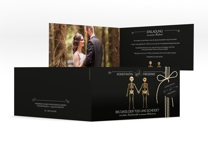 Hochzeitseinladung Bones lange Klappkarte quer schwarz hochglanz mit Skelett-Ehepaar im Cartoon-Stil Hochzeitseinladung Bones lange Klappkarte quer schwarz hochglanz mit Skelett-Ehepaar im Cartoon-Stil