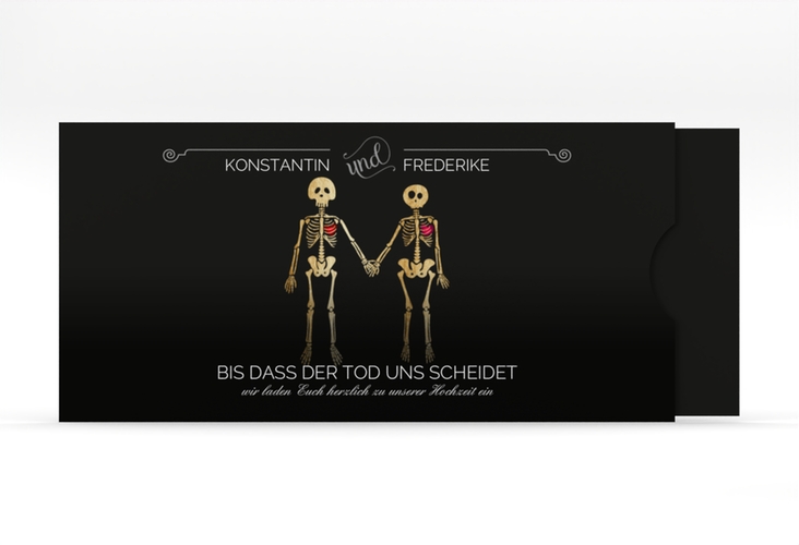 Die außergewöhnliche, ganz in Schwarz gehaltene Kollektion Bones mit den händchenhaltenden Skeletten und ihren rot leuchtenden Herzen ist das i-Tüpfelchen für eine Gothic- oder Rocker-Hochzeit. Mit der witzigen und skurrilen Hochzeitseinladung als Einsteckkarte bekommen Redewendungen wie „bis dass der Tod uns scheidet“ und „ewig währende Liebe“ eine ganz besondere Bedeutung.