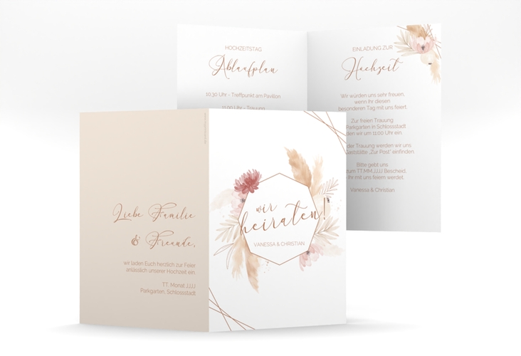 Einladungskarte Hochzeit Bohostyle A6 Klappkarte hoch beige hochglanz mit Pampasgras in Aquarell   Einladungskarte Hochzeit Bohostyle A6 Klappkarte hoch beige hochglanz mit Pampasgras in Aquarell