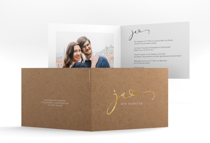 Hochzeitseinladung Jawort A6 Klappkarte quer Kraftpapier gold modern minimalistisch mit veredelter Aufschrift   Hochzeitseinladung Jawort A6 Klappkarte quer Kraftpapier gold modern minimalistisch mit veredelter Aufschrift