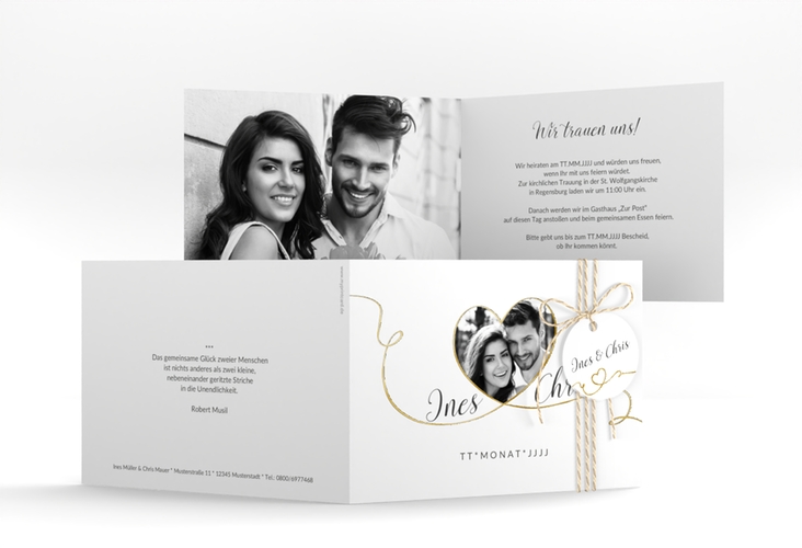 Das verschlungene Herz schafft einen zeitlos schönen Rahmen für die klassisch-romantische Kollektion Dolce. Auf der individuellen Hochzeitseinladung als A6 Klappkarte in weiß verbindet ein zartes Band auf ewig das verliebte Paar.