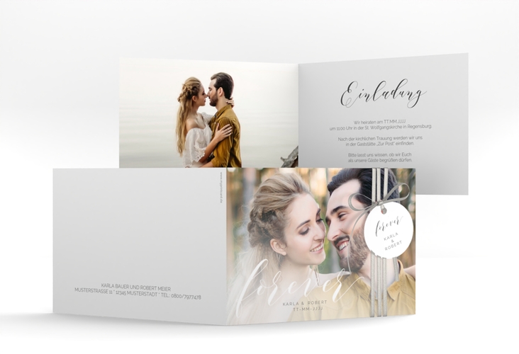 Ein persönliches Foto wird auf der modernen Hochzeitseinladung Promise mit eleganter Kalligrafie kombiniert. Der transparente Verlauf verpasst der A6-Klappkarte mit dem bedeutungsvollen Schriftzug „forever“ einen modernen Touch – für immer.