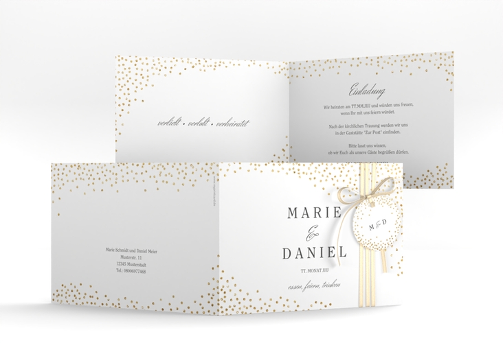 Goldene Glitzerpunkte rieseln wie Konfetti über die A6 Klappkarte. Die Kollektion Glitter in weiß ist ein wahres Highlight für eine feierliche und elegante Hochzeit.