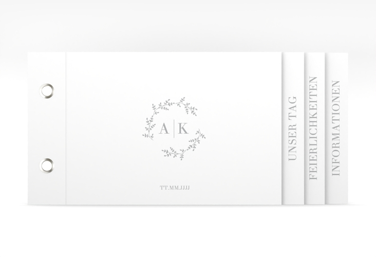Hochzeitseinladung Filigrana Booklet grau in reduziertem Design mit Initialen und zartem Blätterkranz Hochzeitseinladung Filigrana Booklet grau in reduziertem Design mit Initialen und zartem Blätterkranz