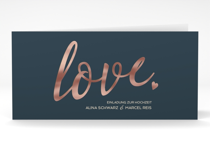 Hochzeitseinladung Glam lange Klappkarte quer blau rosegold   Hochzeitseinladung Glam lange Klappkarte quer blau rosegold