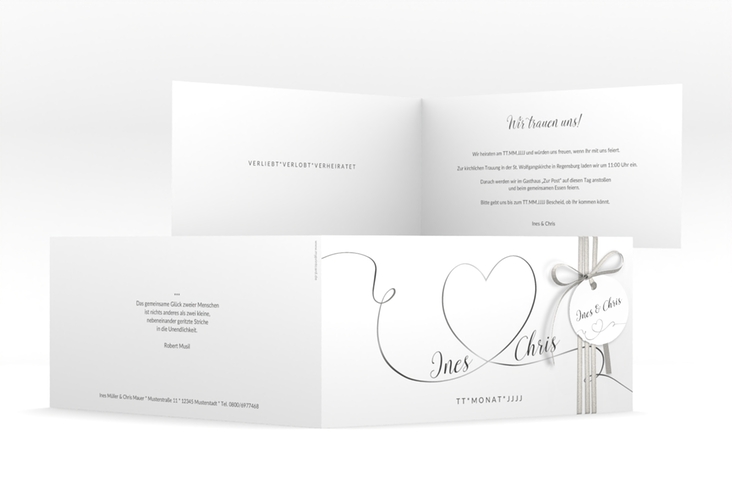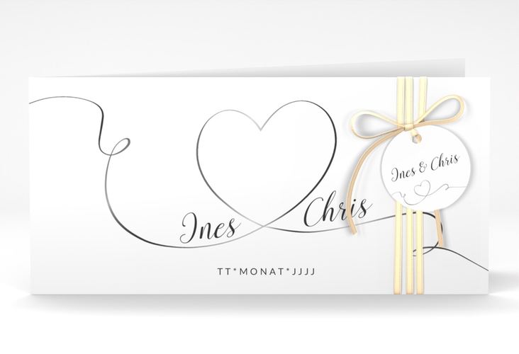 Das verschlungene Herz schafft einen zeitlos schönen Rahmen für die klassisch-romantische Kollektion Dolce. Auf der individuellen Hochzeitseinladung als DIN lang Klappkarte in weiß verbindet ein zartes Band auf ewig das verliebte Paar.