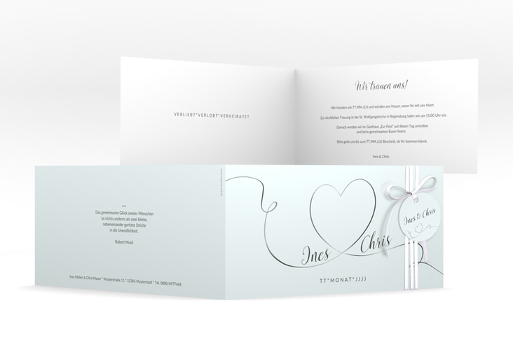 Das verschlungene Herz schafft einen zeitlos schönen Rahmen für die klassisch-romantische Kollektion Dolce. Auf der individuellen Hochzeitseinladung als DIN lang Klappkarte in türkis verbindet ein zartes Band auf ewig das verliebte Paar.