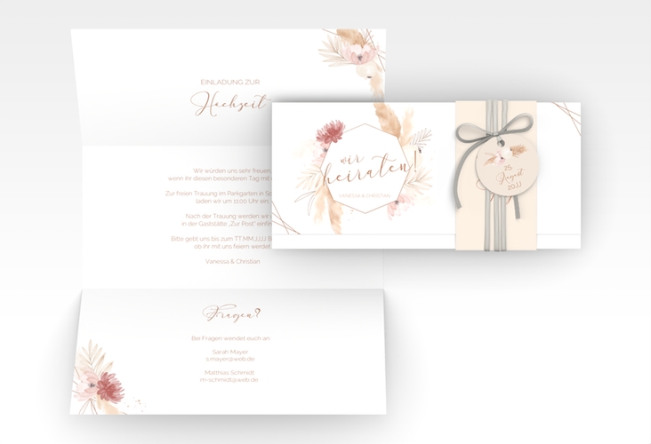 Hochzeitseinladung Bohostyle Wickelfalzkarte + Banderole beige mit Pampasgras in Aquarell Hochzeitseinladung Bohostyle Wickelfalzkarte + Banderole beige mit Pampasgras in Aquarell