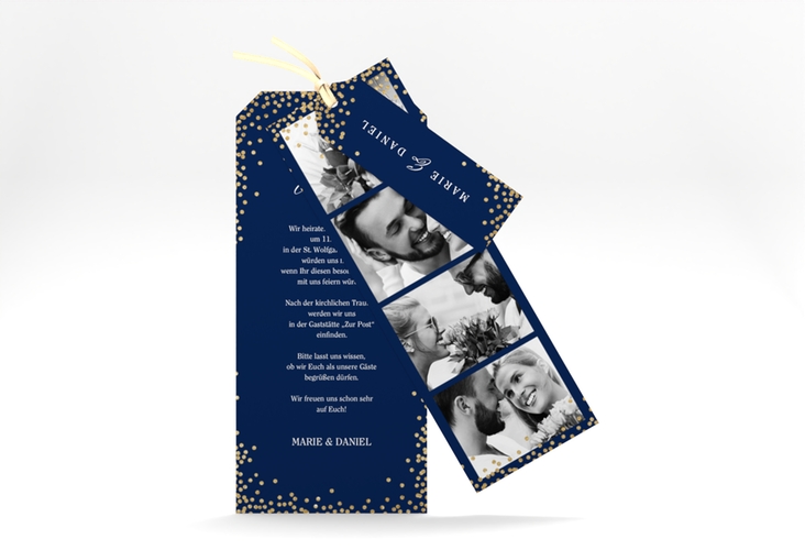 Goldene Glitzerpunkte rieseln wie Konfetti über das Kartentrio. Die Kollektion Glitter in blau ist ein wahres Highlight für eine feierliche und elegante Hochzeit.