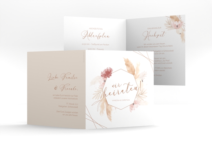 Ein duftiges Bouquet aus Pampasgras und Trockenblumen schmückt die Hochzeitseinladung Bohostyle. Das locker-leichte Aquarell-Design ist in warmen Beige- und Blush-Tönen gehalten und versprüht gute Stimmung und Sommerlaune. Als Highlight lassen sich die geometrischen Rahmen auf der quadratischen Klappkarte mit einer edel glänzenden Folie veredeln.