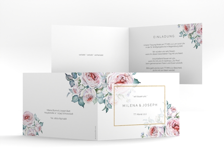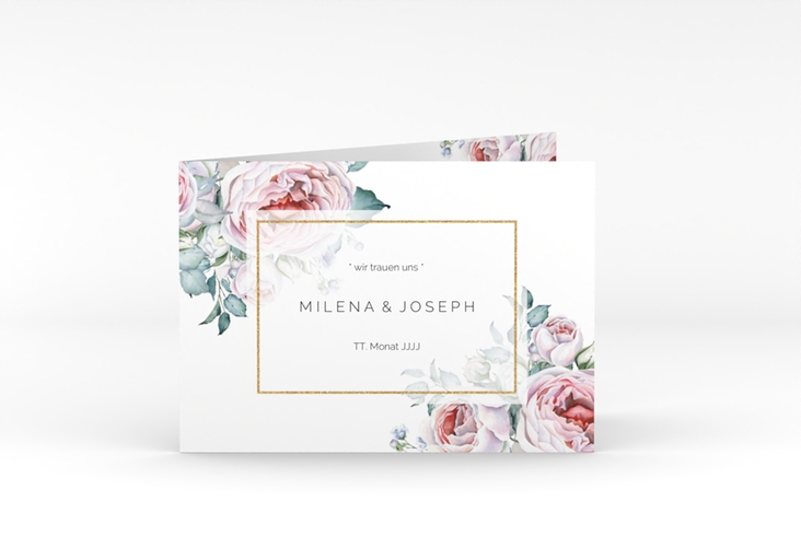 Eine florale Hochzeit begleitet das Design Embrace in weiß. Die Hochzeitseinladung im Format A6 Klappkarte mit pastellfarbenen Rosen und edlem Rahmen wirkt verträumt und zugleich elegant.