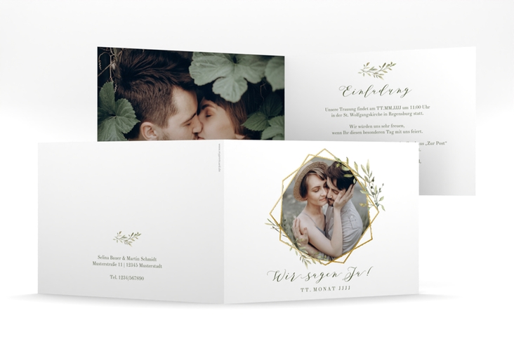 Hochzeitseinladung Acacia mittlere Klappkarte quer gold   Hochzeitseinladung Acacia mittlere Klappkarte quer gold