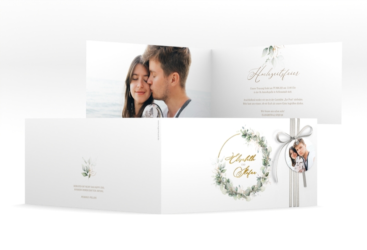 Hochzeitseinladung Selvatica lange Klappkarte quer gold mit Eukalyptus-Kranz   Hochzeitseinladung Selvatica lange Klappkarte quer gold mit Eukalyptus-Kranz