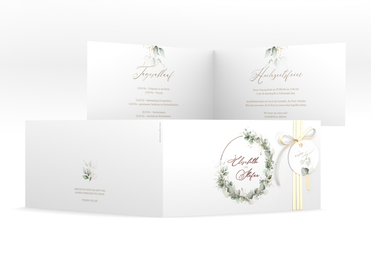 Hochzeitseinladung Selvatica lange Klappkarte quer weiss rosegold mit Eukalyptus-Kranz   Hochzeitseinladung Selvatica lange Klappkarte quer weiss rosegold mit Eukalyptus-Kranz