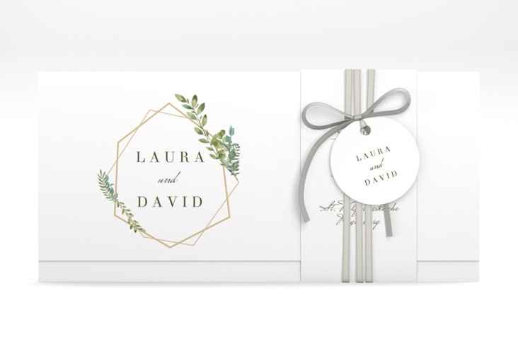 Hochzeitseinladung Herbarium Wickelfalzkarte + Banderole mit geometrischem Rahmen und Blätter-Dekor Hochzeitseinladung Herbarium Wickelfalzkarte + Banderole mit geometrischem Rahmen und Blätter-Dekor