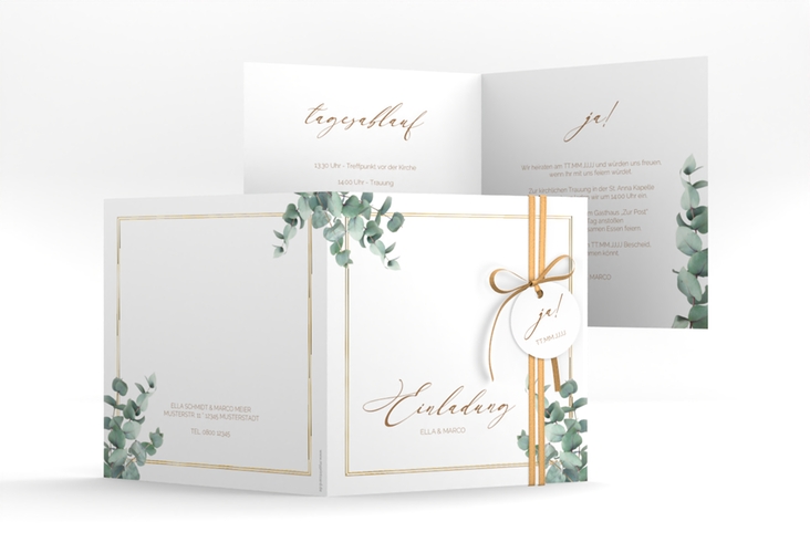 Hochzeitseinladung Eucalypt quadr. Klappkarte gold mit Eukalyptus und edlem Rahmen   Hochzeitseinladung Eucalypt quadr. Klappkarte gold mit Eukalyptus und edlem Rahmen