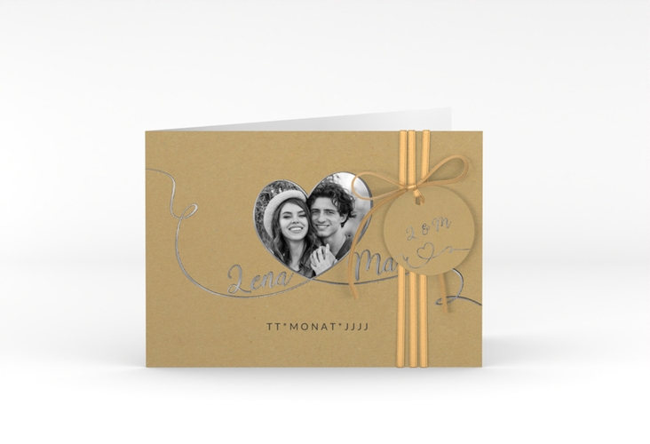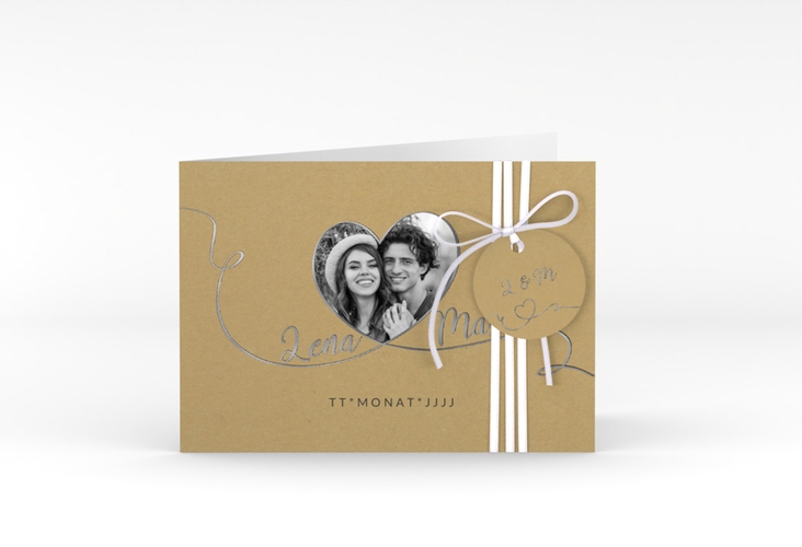 Ein romantisches, geschwungenes Band mit weißer oder schwarzer Schrift umrahmt das Foto in Herzform auf der Hochzeitseinladung Herzensbund . Das Design in Kraftpapier-Optik unterstreicht den natürlichen Vintage-Look der A6 Klappkarte im Querformat und schafft eine Verbindung für die Ewigkeit.