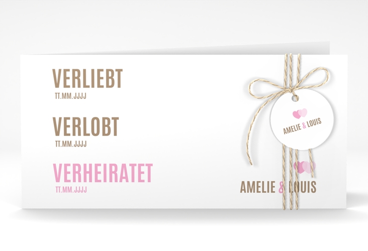 Verliebt, verlobt ... verheiratet! Das ist das Motto der Kollektion Couple. Die Einladungskarte in rosa spricht für sich und lässt als DIN lang Klappkarte zwei verliebte Herzen im selben Takt schlagen.