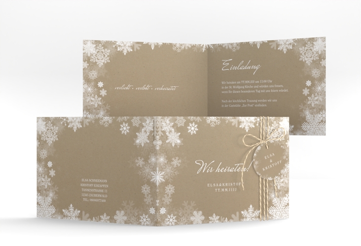 Hochzeitseinladung Snowfall A6 Klappkarte quer Kraftpapier mit Schneeflocken für Winterhochzeit Hochzeitseinladung Snowfall A6 Klappkarte quer Kraftpapier mit Schneeflocken für Winterhochzeit