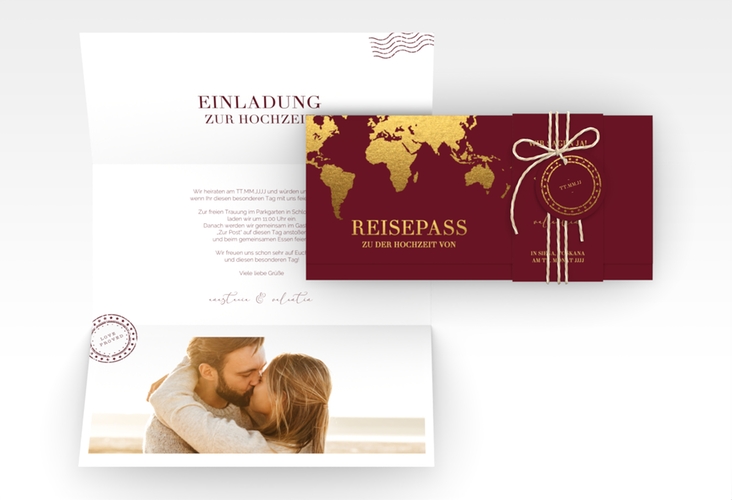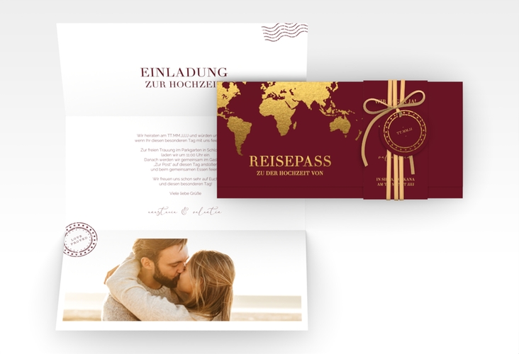 Hochzeitseinladung "Traumziel" - Wickelfalzkarte + Banderole