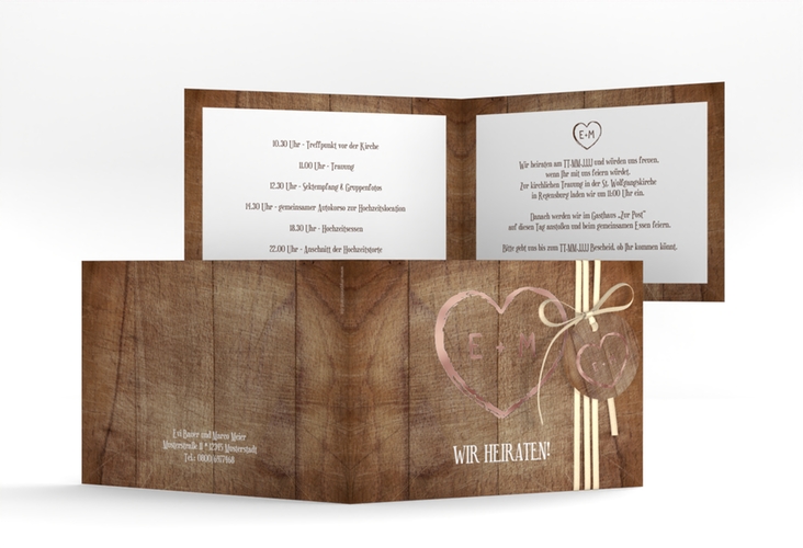 Hochzeitseinladung Wood A6 Klappkarte quer rosegold in rustikaler Holz-Optik mit Herz   Hochzeitseinladung Wood A6 Klappkarte quer rosegold in rustikaler Holz-Optik mit Herz