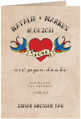 Favorit Danksagungskarte Hochzeit Tattoo A6 Klappkarte hoch beige mit Herz und zwei Schwalben