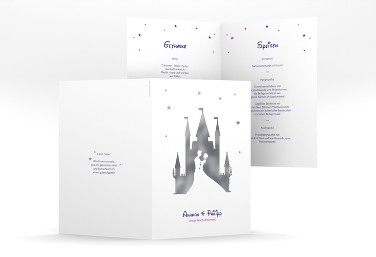 Eine unvergessliche Traumhochzeit gelingt mit der Menükarte Castle als A5-Klappkarte in lila. Das romantische Design verspricht ein Happy End für das glückliche Hochzeitspaar vor einem traumhaften Märchenschloss.