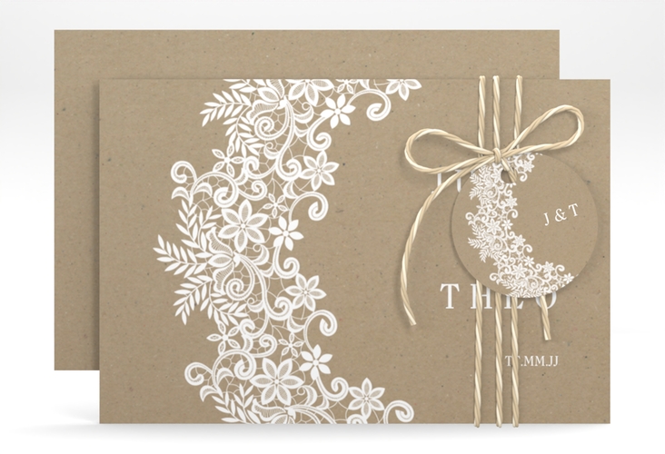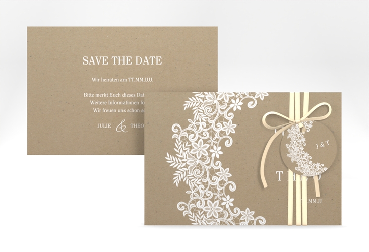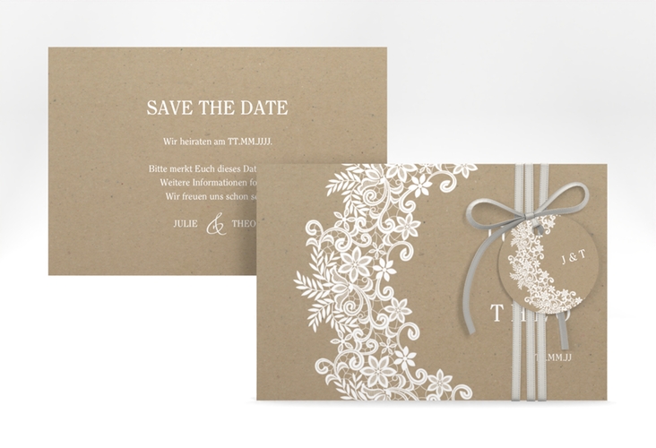 Save the Date-Karte Mariage A6 Karte quer Kraftpapier mit Bogen aus weißer Spitze Save the Date-Karte Mariage A6 Karte quer Kraftpapier mit Bogen aus weißer Spitze
