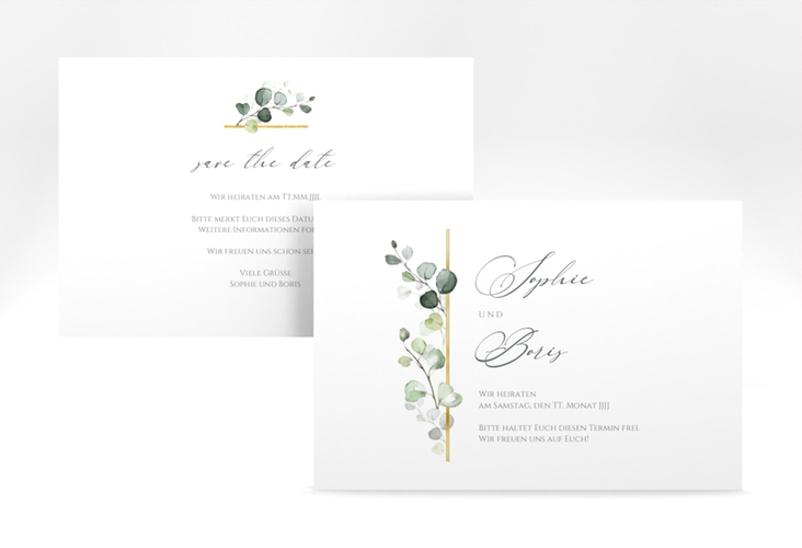 Save the Date-Karte Adelya A6 Karte quer gold elegant mit Eukalyptus-Motiv   Save the Date-Karte Adelya A6 Karte quer gold elegant mit Eukalyptus-Motiv