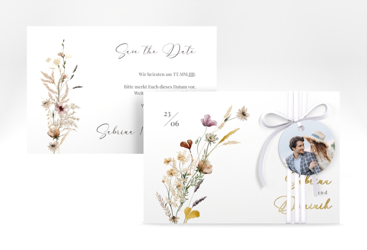 Save the Date-Karte Sauvages A6 Karte quer weiss gold mit getrockneten Wiesenblumen   Save the Date-Karte Sauvages A6 Karte quer weiss gold mit getrockneten Wiesenblumen
