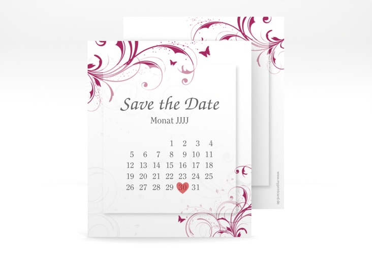 Ein klassisches, edles Design mit geschwungenen Ranken und Schmetterlingen zeichnet die Kollektion Palma als Kalenderblatt-Karte in pink aus. Persönliche Fotos runden die „Save the Date“-Karte zu einer stilvollen Hochzeit ab.