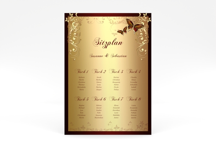 Mit vielen Schmetterlingen und edlen Ornamenten wirkt der Sitzplan Toulouse in rot besonders glamourös. Das opulente Design auf dem Poster im Hochformat unterstreicht das Motto einer märchenhaften Traumhochzeit.
