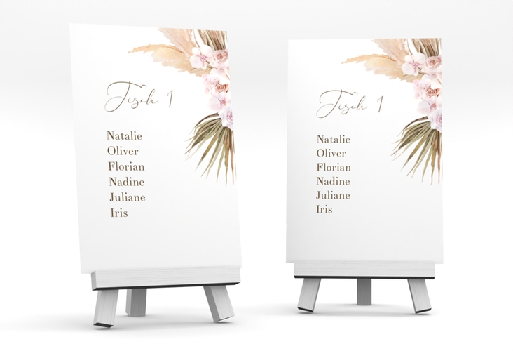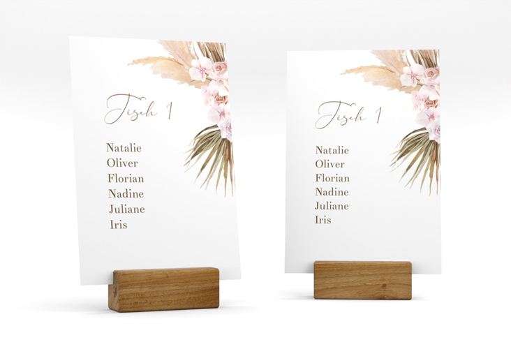 Eine Kombination aus Trockenblumen, puderrosa Orchideen, Rosen und Pampasgras macht den romantischen Vintage-Look des Tischaufstellers Nude aus. Zarte Aquarell-Farbe unterstreicht den zu einer Boho-Wedding oder Blush-Wedding passenden Stil der A6 Karte. Mit einem Holzfuß oder einer kleinen Staffelei lässt sich die Karte auf dem Gästetisch platzieren.