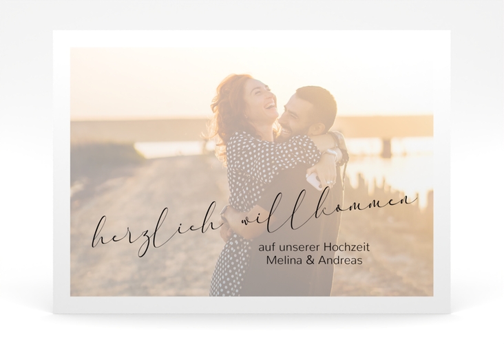 Für ganz viel Hochzeits-Flair sorgt das Willkommensschild im Design Lucent. Seinen modernen Stil erhält das querformatige Poster durch den transparenten Look, der ein persönliches Foto perfekt mit eleganter Kalligrafie verbindet.