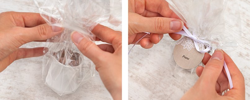 ... und verhüllen dieses anschließend mit der Klarsichtfolie. Mit dem Band verschließen wir die Klarsichtfolie und binden unseren personalisierten Geschenkanhänger daran fest. Und schon ist unser kleines Gastgeschenk fertig!