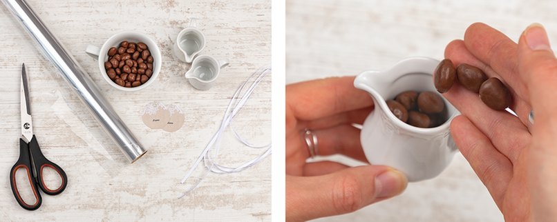 Die Schoko-Bohnen in der gewünschten Geschmacksrichtung füllen wir in das Milchkännchen hinein ...
