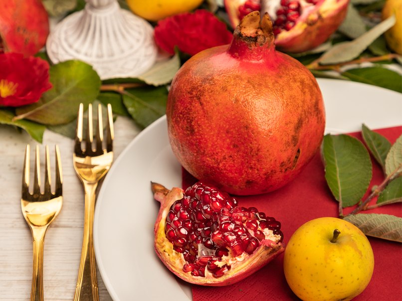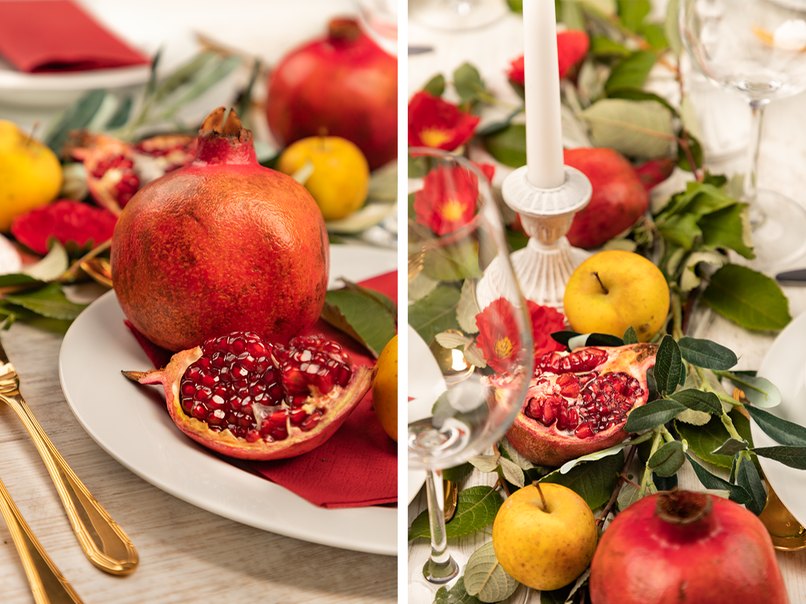 Am Ende eines Sommers gibt uns die Natur dankend zurück, was über das Jahr hinweg gewachsen ist. Wer einen eigenen Garten hat, bekommt die Früchte direkt von dort. Alle anderen finden das Ergebnis in der regionalen Obst- und Gemüseabteilung im Supermarkt. Wir haben ein bissen hiervon und ein bisschen davon verwendet: Aus dem Supermarkt haben wir uns die wunderbar dunkelroten Granatäpfel besorgt und den Rest haben wir aus dem eigenen Garten geerntet. Die Farben harmonieren dabei wunderbar: Das erfrischende Gelb der Äpfel, das Rot der saftigen Granatäpfel und das dunkle Grün der Blätter. In Kombination mit dem Gold von dem edlen Besteck ergibt sich ein wahrer Blickfang!