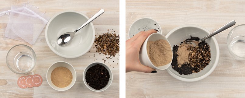 In der Schüssel vermischen wir vorsichtig das Saatgut mit der Blumenerde und der Tonerde...