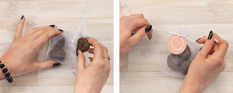 Sobald die Samenkugeln gut getrocknet sind, können wir sie verpacken: Wir haben dazu ein Organzasäckchen mit jeweils drei Samenkugeln befüllt und mit einem Geschenkanhänger verziert.
