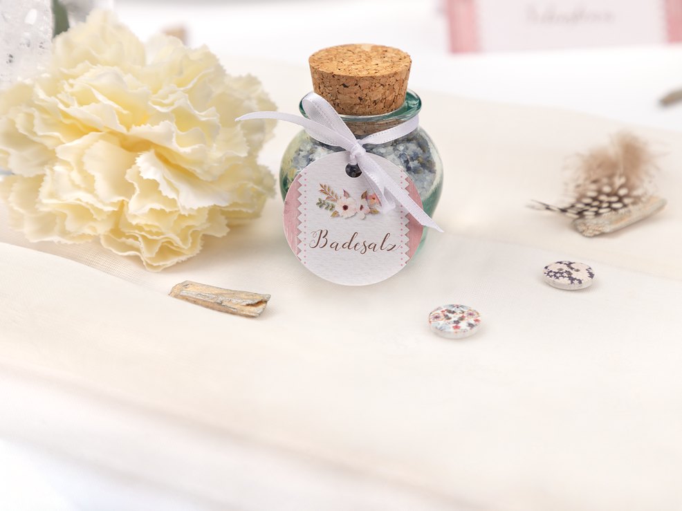 Nachdem das Badesalz gut getrocknet ist, befüllen wir damit die kleinen Gläser und binden den beschrifteten Geschenkanhänger daran fest. Fertig ist das Gastgeschenk!