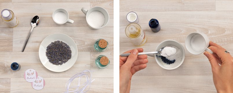 Zu dem Badesalz könnt Ihr Zusätze hinzugeben, welche eine pflegende oder duftende Eigenschaft haben. Achtet jedoch darauf, dass keine der Zutaten hautreizend ist.