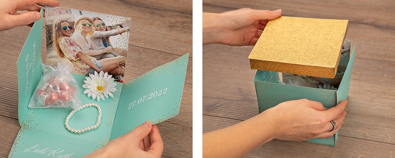 Bei dieser individuellen Geschenkidee ist die Box so aufgebaut, dass beim Abheben des Deckels alle vier Seiten der Box nach außen fallen. Damit ist die Verpackung selbst ein Teil der Überraschung. Die Gestaltung der Box könnt Ihr dabei frei wählen und so kann diese Idee auch für viele verschiedene Anlässe umgesetzt werden. Sowohl kleine Gegenstände, als auch Gutscheine lassen sich in der Box gut unterbringen.