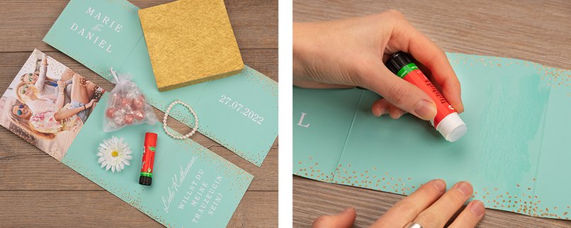 Bei einer der beiden Karten tragen wir im mittleren Bereich großzügig Kleber auf ...