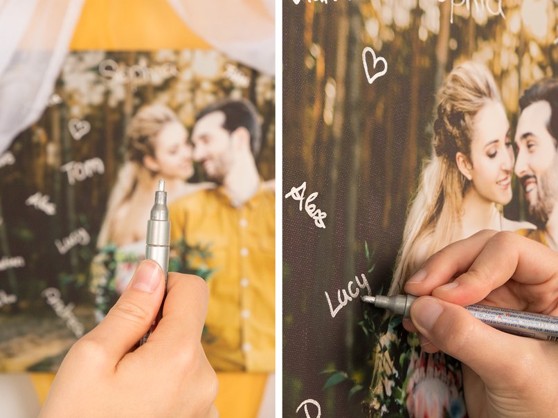 Damit Eure personalisierte Leinwand noch einzigartiger wird, lasst doch Eure Gäste sich darauf verewigen. Beim Hochzeitsfest oder einem anderen Anlass dürfen Eure Liebsten mit ihrem Namen unterschreiben. Auch eine kleine Botschaft oder ein Glückwunsch kann auf der Leinwand untergebracht werden. Wenn alle Gäste unterschrieben haben, habt Ihr all Eure Lieblingsmenschen und ein wunderschönes Foto von Euch auf einer einzigen Leinwand. Während ein Gästebuch nur im Regal steht, gestaltet diese Leinwand Euer Zuhause mit!