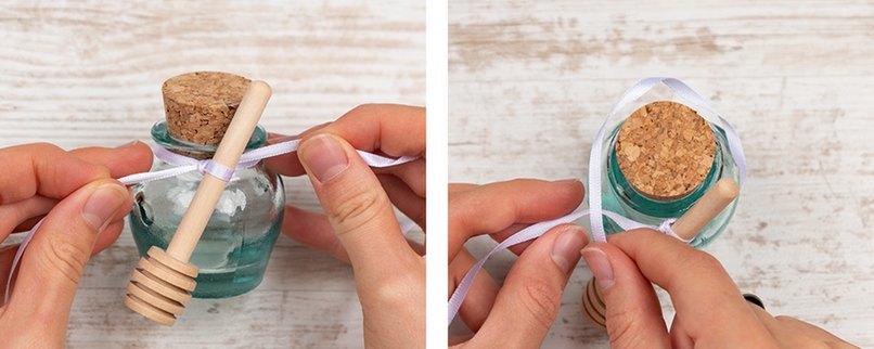 ... und knoten dort den Honiglöffel fest. Wir haben dabei darauf geachtet, dass sich der Knoten zwischen Honiglöffel und dem Glas befindet und damit auf der Vorderseite nicht zu sehen ist. Anschließend wickeln wir das Band ein zweites Mal um das Glas ...