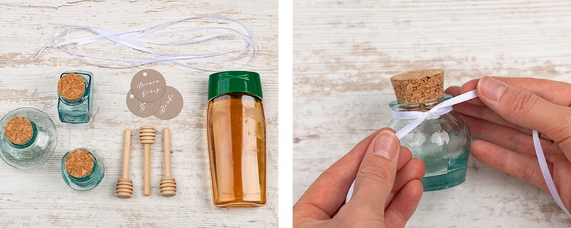 Geschenke, die ein paar Nummern kleiner als die Standardgröße sind und mit liebevollen Details verziert sind, lassen vor allem Frauenherzen höher schlagen: "Oh wie süüüß!". Darum haben wir uns bei diesem Gastgeschenk für ein Miniaturausgabe eines Honigtopfes mit der entsprechenden Dekoration aus Honiglöffel und persönlichem Geschenkanhänger entschieden.