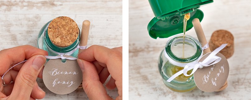 Damit Eure Gäste wissen, was für eine Sorte im Geschenk enthalten ist, und demnächst auf dem Frühstücksbrötchen landet, schreibt die Honigsorte am besten mit auf das Etikett oder den Geschenkanhänger.