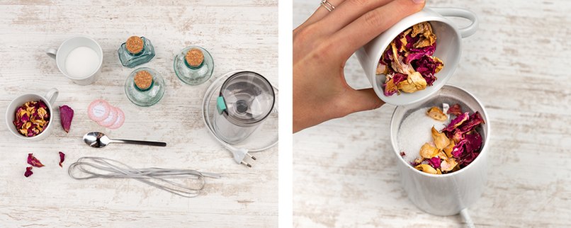 Die getrockneten Blütenblätter geben wir zusammen mit etwas Zucker in den Mixer. Nach dem Mixen können wir den Rosenzucker nach Belieben mit noch mehr Zucker verdünnen, oder zusätzlich etwas Rosenöl dazugeben, sodass der Duft noch intensiver wird.