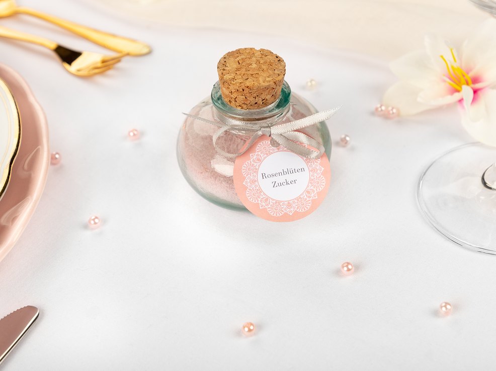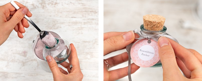 Den fertigen Rosenzucker füllen wir dann in unser kleines Glas ab und verzieren dieses mit einem dekorativen Band und unserem beschrifteten Geschenkanhänger.